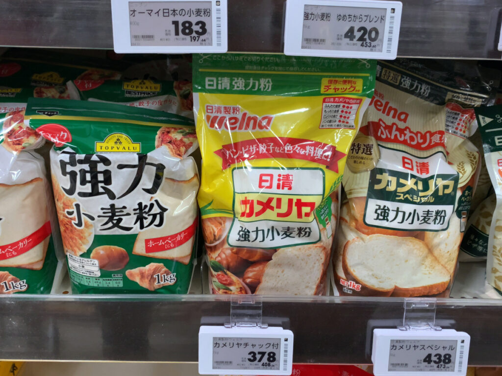 大きなスーパーではいくつかの種類の強力粉が販売されていますが、さて、どれにしようかと迷うのは、パン作り経験を積んで小麦粉にこだわりたくなってからでかまいません。初めてのパン作りには、TOPVALUやくらしモアのようなスーパーのプライベートブランドの強力粉が安価でおすすめです。